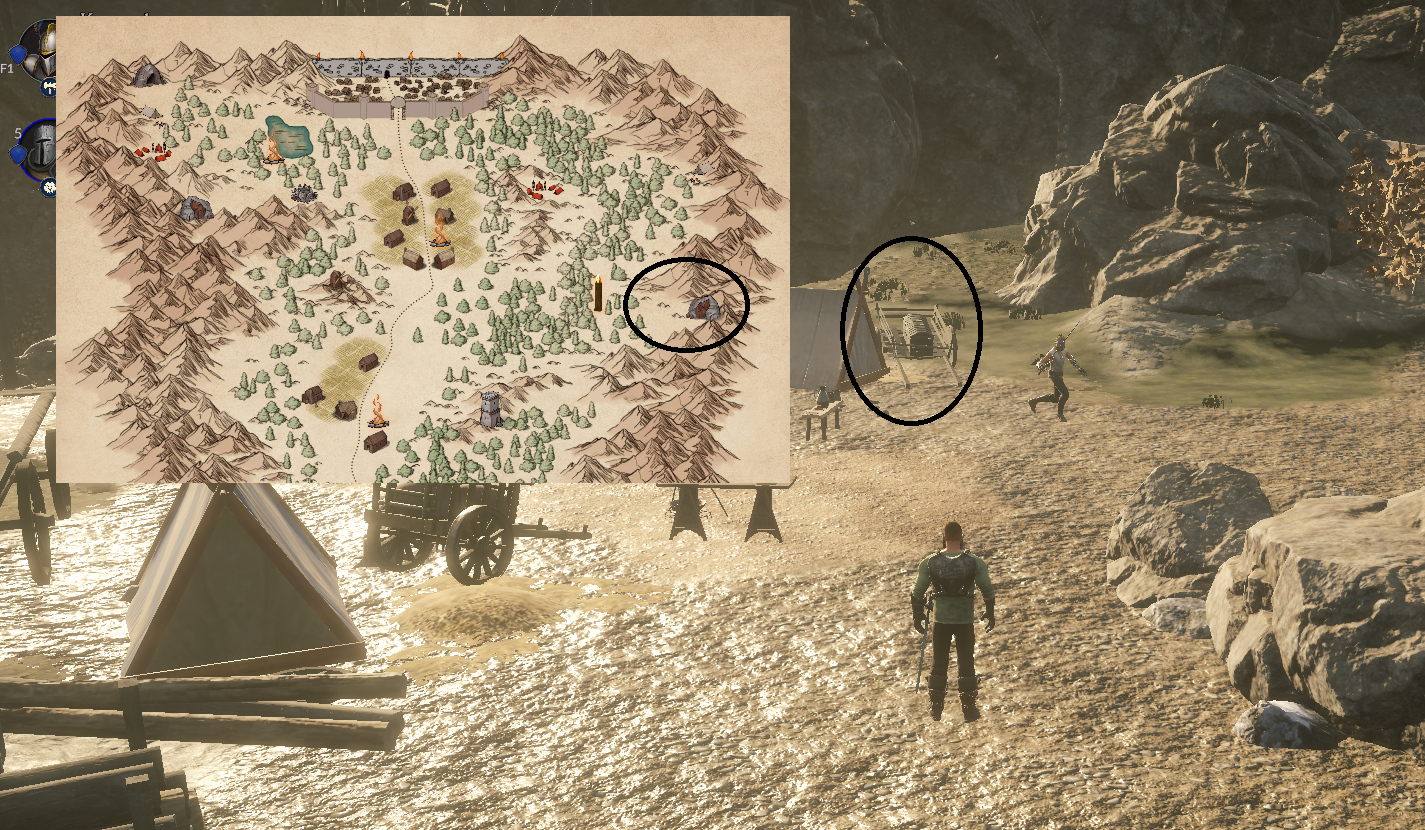 Map highlighting where the camp is located to interact with the weapon cache for the quest The Missing Arms Race part 2