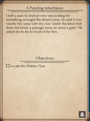 The Second Clue is located in the ruins North of the campsite with the Emberstone quest giver Treasure Hunter Archie Swish.