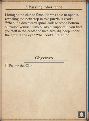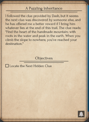 After talking with Mortimer, he wants you to bring him whatever you find, and he gives you the clue. The clue is located in Aquifer Karst, in the very first set of ruins you see after leaving the firepit. Once you find the clue you will have to decide whether to bring it back to Dash or Mortimer. (in this guide I chose Dash)