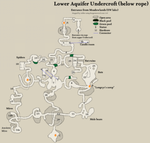 Entrance from Meadowlands is to Upper Aquifer Undercroft. Using the rope, the Lower section can be reached. There are still unmapped areas in this version of the map. The numbers are meant to be referenced to in the Wiki page.