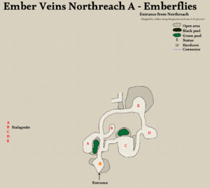 This Ember Vein is located throughout southern Northreach and is intended for players level 10-12. The easiest way to locate an Ember Vein is by standing adjacent to a respawn node. Purple and green lights will display in the sky where ruptures(green)are and where enterable Ember Veins(purple) are located.