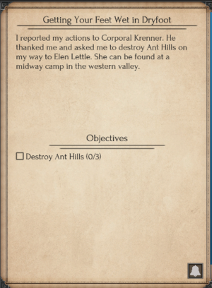 • Krenner sends you to destroy 3 Ant Hills. The best place to do these are the higher level hills right by Sheercrook Hideaway.