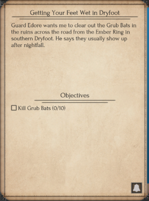 Talk to Monroe Edore in Dryfoot. He is at the first campfire / tower close to Northreach zone line. He needs some help clearing out grub bats.