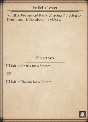 After you kill the 10 Bear Offspring your quest will update saying to speak to either Hallick or Therrin for a reward.