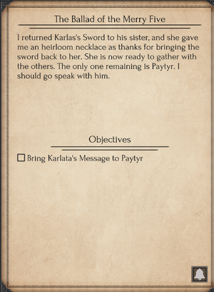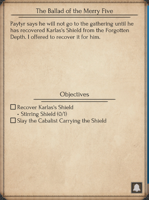 Once you recover Karlas sword from a Snatchscale Brute return to Karlata with it. She will reward you with a Neclace and then she will want you to take a message to Paytyr. Paytyr will want you to recover Karla's Shield. This is a tough one! You have to kill "Manslayer Captain Victus" who is a 4 chev in the dungeon Forgotten Depths 2 (FD2).