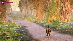 • Follow the road a pretty short distance (from the bottom of the stairs when you first hit the road, follow the road with the run buff for 55 seconds) until you come to the specific tree shown in the picture below. You will see a large tree covered in leaves, a bush next to it , and a log in the road right in front of it.