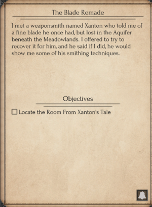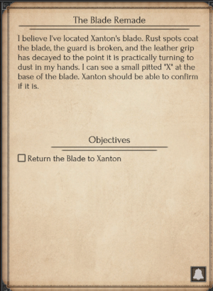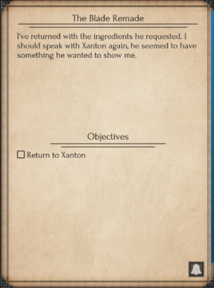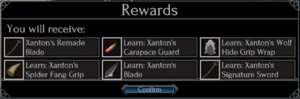 • Return to Xanton with the materials to receive his sword, and the recipes to create a similar, slightly less powerful but tradable version.